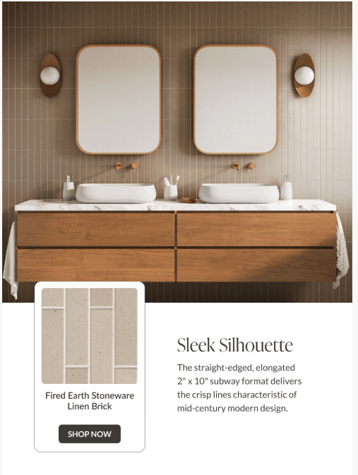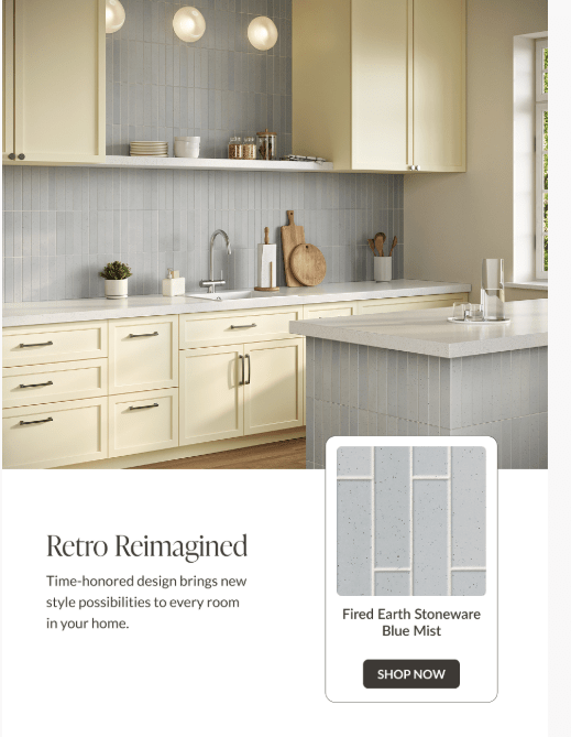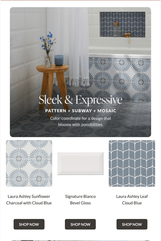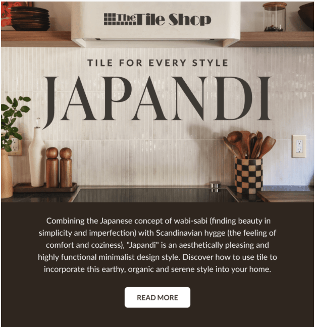 Promoting a blog post—Tile for Every Style: Japandi—this email details the style’s principles and highlights specific products and spaces that exemplify Japandi design. Click Through Rate: 1.49%