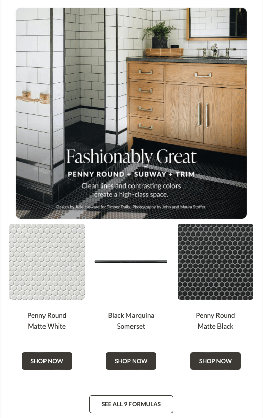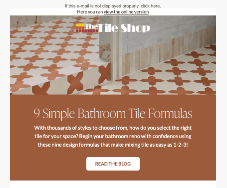 Promoting a blog post, this email detailed tile design formulas—three complementary tile styles that create amazing spaces. Click Through Rate: 4.16%